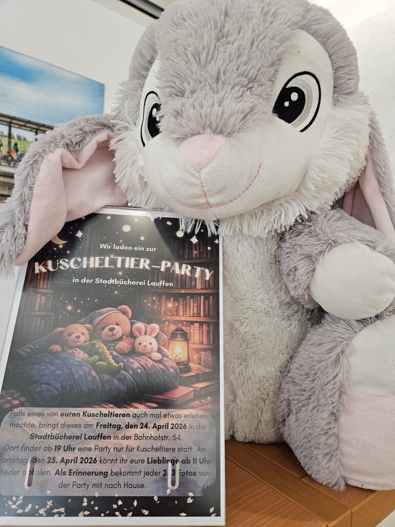 Falls eines von euren Kuscheltieren auch mal etwas erleben möchten, bringt dieses am Freitag, den 24. April 2026 in die Stadtbücherei Lauffen in der Bahnhofstr. 54. Dort findet ab 19 Uhr eine Party nur für Kuscheltiere statt. Am Samstag, den 25. April 2026 könnt ihr eure Lieblinge ab 11 Uhr wieder abholen. Als Erinnerung bekommt jeder 2- 3 Fotos von der Party mit nach Hause